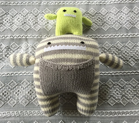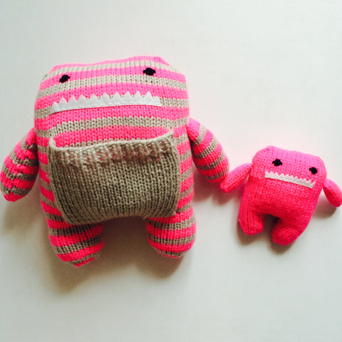 Lola measures at approximately 11 inches high and 10 inches wide (without the arms). Do remember that each hand knit monster is unique and may slightly vary in size.
