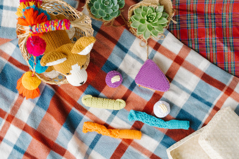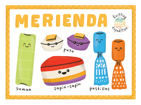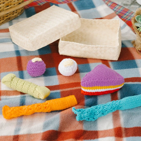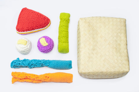 This uniquely Filipino Merienda Play Set includes a slice of sapin sapin, puto with cheese, ube puto with cheese, a suman and 2 pastillas in the traditional colorful wrapping. It comes in a 7x3x2" buri box with an illustrated post card by local artist Ella Llama!
