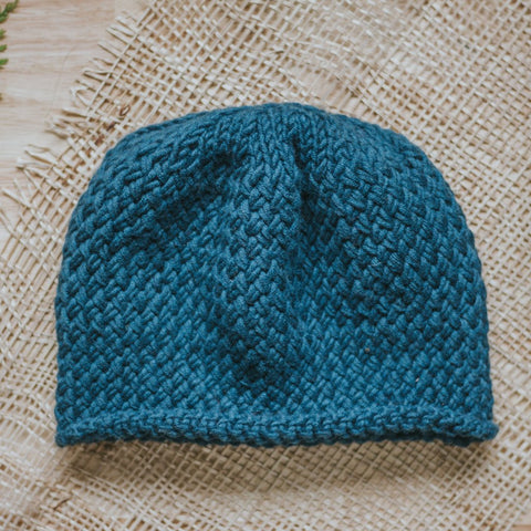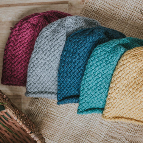 The "Liga-U" (bilao in Ifugao) is a handknit hat that was patterned after the traditional flat, round winnowing basket used to prepare rice.  It comes in 7 colors:  beetroot, beehive, teal, grey, black and white; and also comes with a matching thick cowl.  It is made of chunky 70% merino wool and 30% cotton.